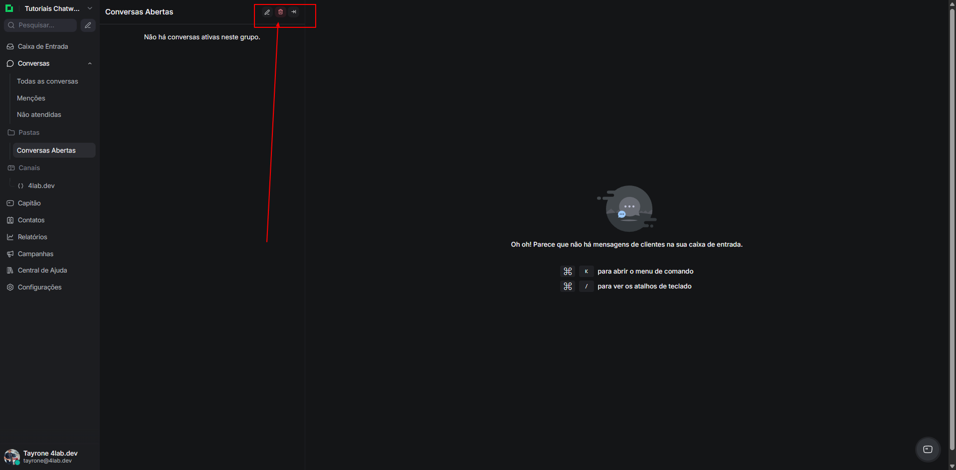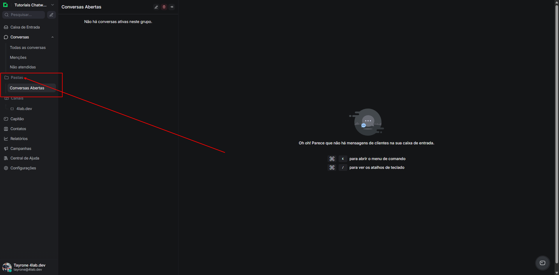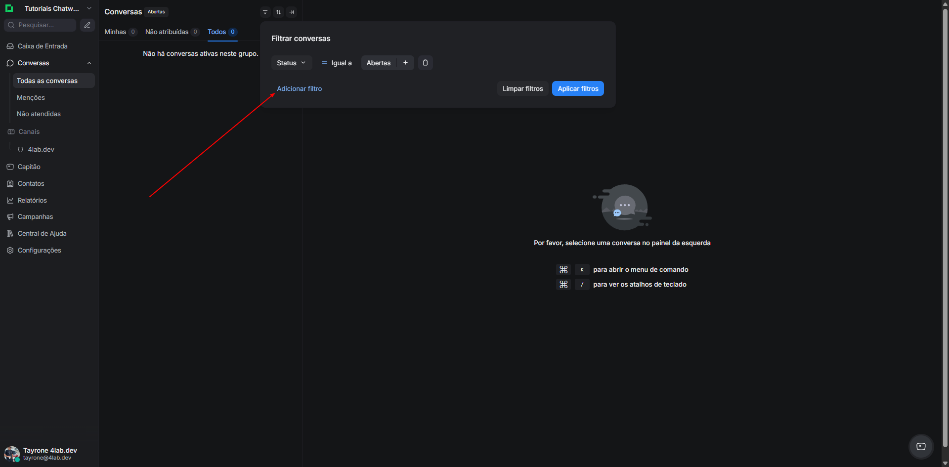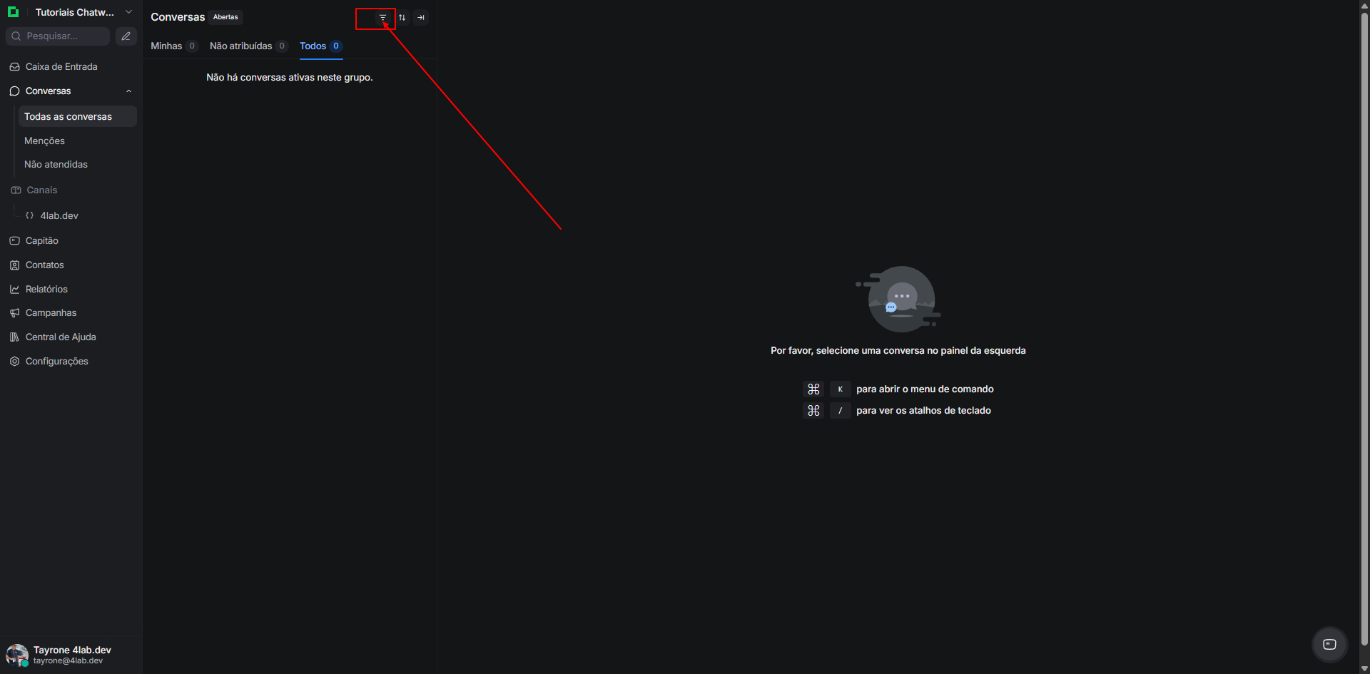 Navegue até o painel de filtros, clicando no botão “Filtros” acima da lista de conversas.